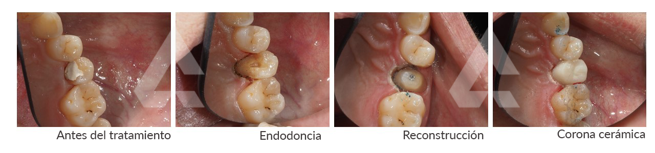 Empezamos por realizar una endodoncia. Después se realizó una gingivectomía y reconstrucción de la pieza, y se terminó por colocar una corona cerámica.